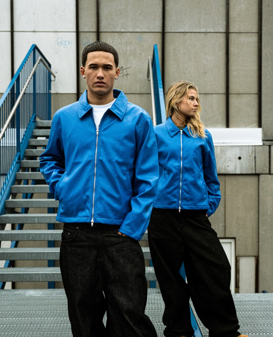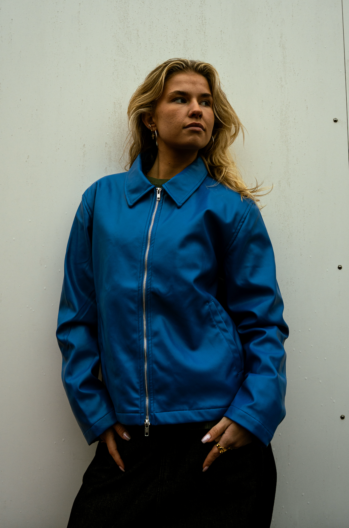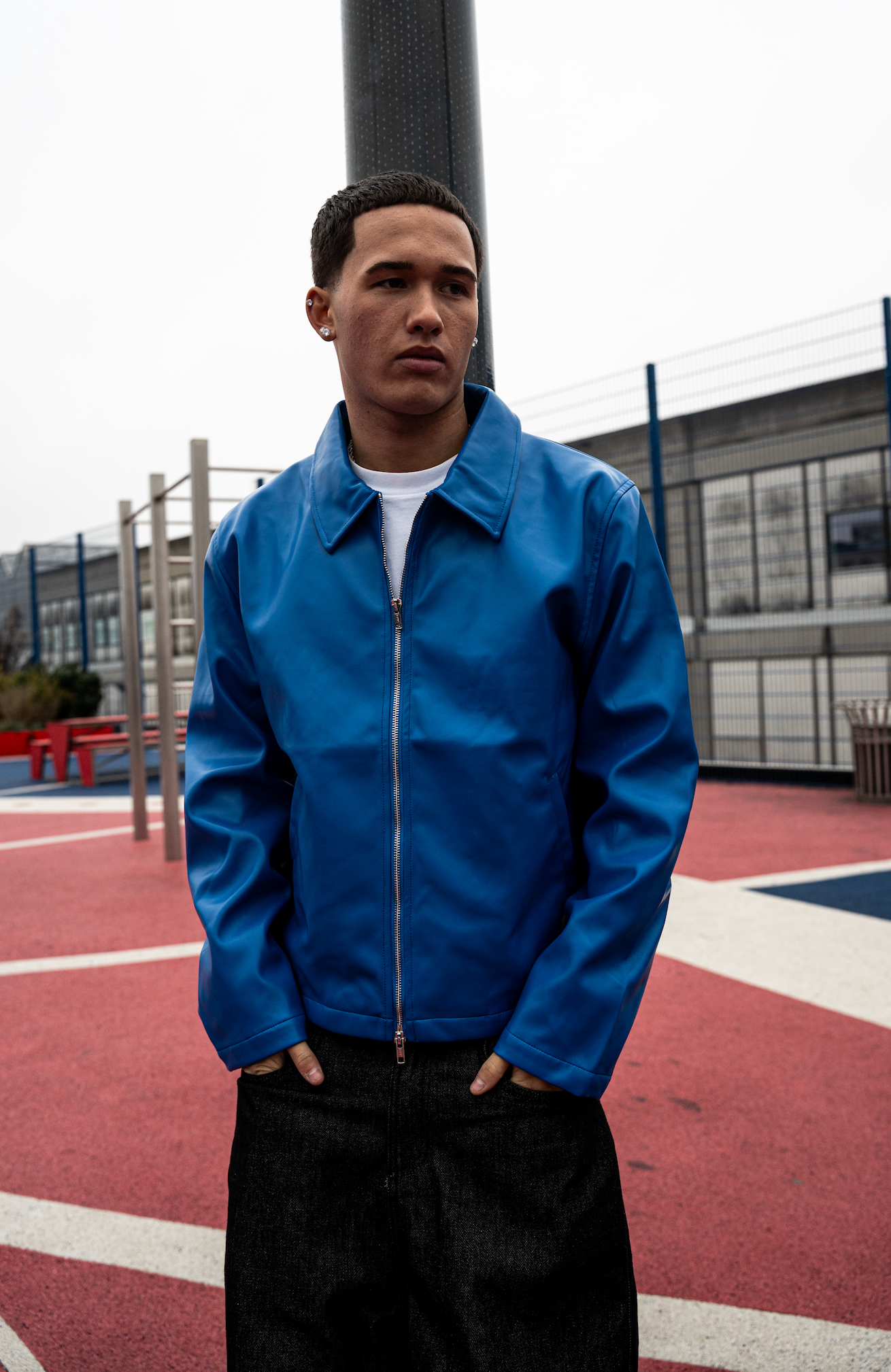 This blue PU leather jacket features a clean, comfortable fit with a strong overall shape. Made from high-quality PU leather, it offers a smooth finish and a premium look without compromising on comfort. Designed in collaboration with Elley x Huess, it blends a modern edge with everyday wearability — perfect for elevating both casual and street-style outfits.